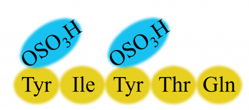 Things did not end there. Mass spectrometry showed that the sequence weighed 846, which was 160 more than five amino acids. This fact led to the discovery of the structure of the sequence: a sulfate group with a weight of 80 was attached to the first and third tyrosines.