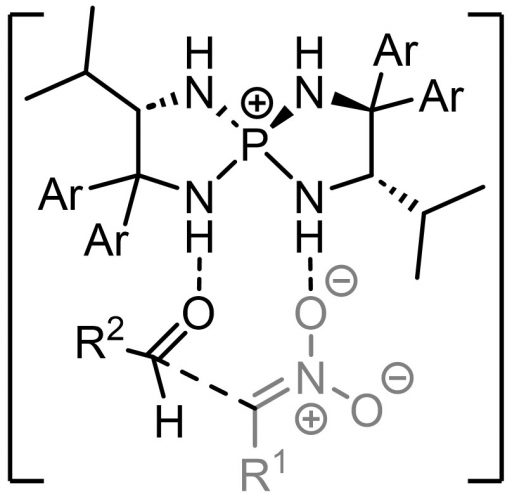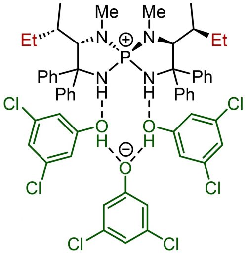 (Top) A form of aminophosphonium salt, which takes on various shapes; positively charged catalyst molecule attracts negatively charged molecules and captures them at the site of hydrogen bonding. In this form, a Cl– (chloride ion) is attached.