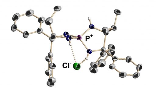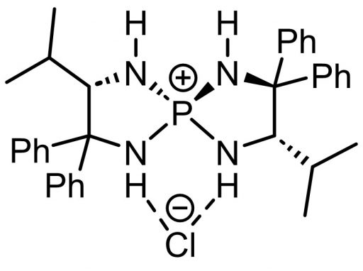 (Top) A form of aminophosphonium salt, which takes on various shapes; positively charged catalyst molecule attracts negatively charged molecules and captures them at the site of hydrogen bonding. In this form, a Cl– (chloride ion) is attached.