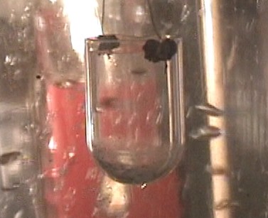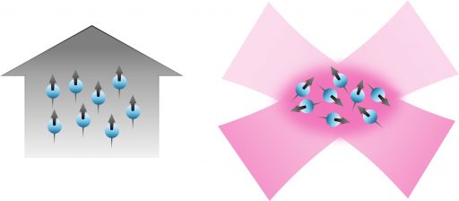 (R) Atoms captured by an optical trap: lasers are shone from two directions, capturing atoms at their intersection. Free from magnetic constraints, the tiny atomic magnets can orient in any direction.