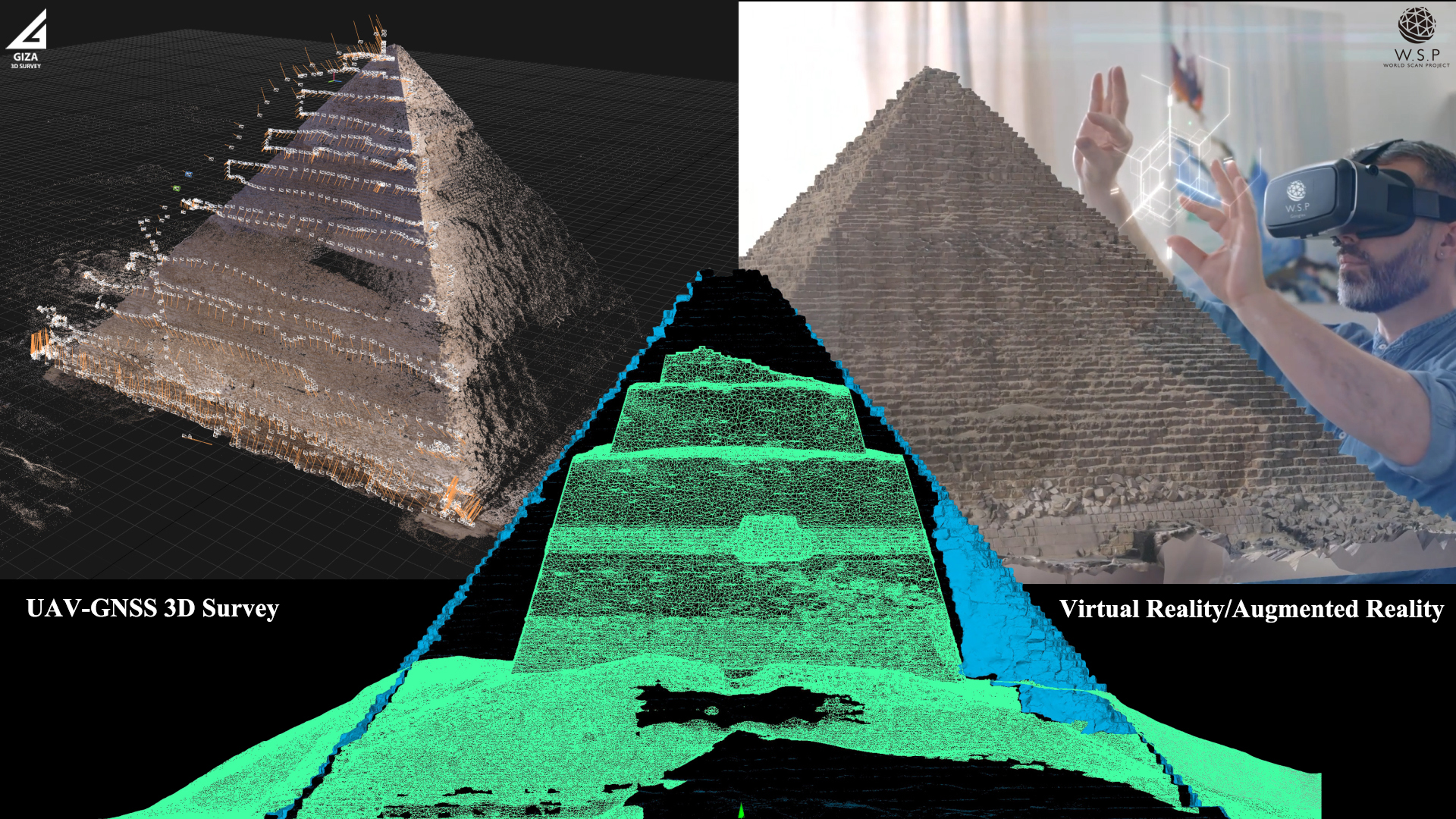 本研究グループは、これまで国内外の研究機関と民間企業と共にギザ(エジプト)の三大ピラミッドを含めた7基の古代エジプトの巨石建造物の3Dデータを取得してきました。株式会社ワールドスキャンプロジェクトは、ドローン技術と3Dデータ化技術を用い、世界遺産のデジタル・アーカイブを作成し、それを未来社会へ残すプロジェクトを行っています。本研究では、考古学分析に用いることができる3D技術とVirtual Reality(VR)を用いたビジュアライゼーションの研究開発を行い、ピラミッドに代表される古王国時代(紀元前2543〜紀元前2120年頃)の巨石建造物の構造と、その建造方法に新たに光を当てることを目的としています。